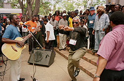 and that mystical African gentility and humility so difficult for the Western mind to grasp. The rains came. That made for soggy, muddy pathways through a University of Zimbabwe campus green with growth and splashed with African colours. Rains are so critical in Africa where droughts too often destroy the continent's development. For visitors, the daily deluges and spectacular thunderstorms may have been a nuisance; for Africans they meant life. Drums throbbed, mbiras hummed and there was a kind of infectious happiness that comes from a spirituality and culture that defy the more cerebral Northern sense of order and logic.