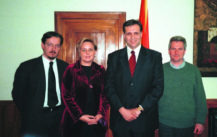 ![]() En una visita de prensa organizada recientemente por el CMI a la región de los Balcanes, los periodistas fueron acogidos por el Sr. Boris Trajkovski, elegido presidente de la ex República Yugoslava de Macedonia en diciembre de 1999. El Sr. Trajkovski es el primer jefe de Estado que pertenece a la Iglesia Metodista Unida de ese país predominantemente ortodoxo y musulmán. Es un predicador laico de su iglesia local que cuenta con 4.000 miembros. En la fotografía está acompañado de algunos miembros de la delegación: Alexander Belopopsky (secretaría para Europa del CMI), Karin Achtelstetter (Relaciones con los Medios de Información, CMI) y el periodista danés Bjarke Larsen. |
